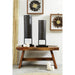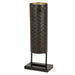 Tall, cylindrical pierced black metal lantern table decor on a rectangular metal base